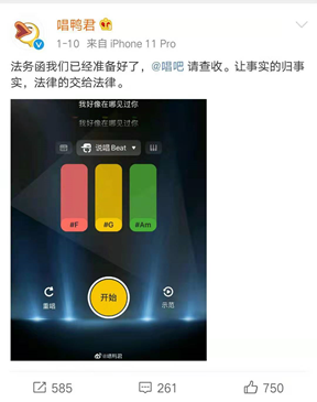 不过,唱鸭也毫不示弱,随后也在官方微博发布声明称,已经准备好了法务函,会通过法律来维权。《国际金融报》记者注意到,该微博评论下已有不少网友纷纷支持唱鸭维权。