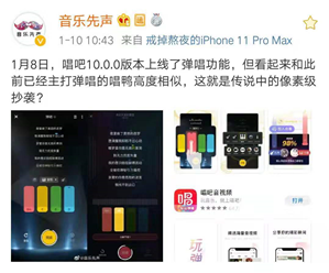 1月10日,自媒体博主“音乐先声”发微博称,唱吧上线的弹唱功能与之前主打弹唱的唱鸭高度相似,并直指其是。