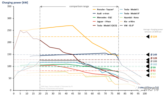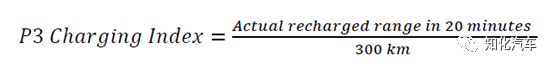 从上图可以看出,SOC 20%-80%期间,Porsche Taycan的平均功率为224kW,远领先其他车型;Audi e-tron的平均功率为149kW,Tesla Model 3的平均功率为128kW。这个仅仅从充电功率上来进行比较的思路有一个问题:。因此,日本的P3公司(P3 automotive GmbH)提出P3快充指标的概念,希望从消费者使用的角度,更真实地来体现不同车型快充能力。这个指标的计算如下: