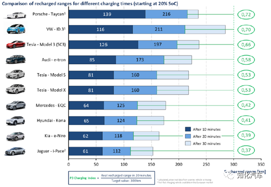 能够看出,现在还没有一款车型可以达到比值1的水平,在20分钟内,表现较好的是Taycan,其次是VW I.D 3,随后是Model 3。图中,还给出了另外两个时间段,即10分钟内,30分分钟内充电量可行驶的距离。在30分钟内,表现最好的是I.D3。